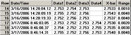 This data table displays data records stored with a subgroup size of three, followed by data records stored with a subgroup size of four. The table displays four Data columns because the largest subgroup size in this data retrieval is four.