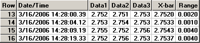 However, when the retrieval contains only data that was stored with a subgroup size of three, the data table displays only three Data columns: