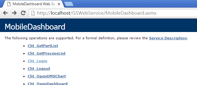 To do this, launch a web browser and go to http://localhost/GSWebService/MobileDashboard.asmx