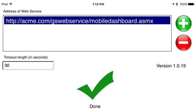 For a web server, enter http://<URL>/GSWebService/MobileDashboard.asmx .
