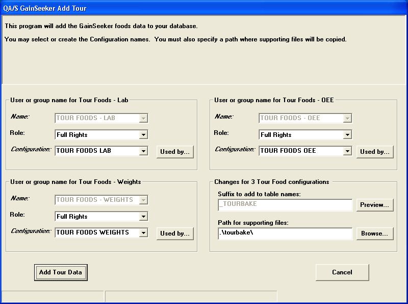 If these table names do not yet exist in your GainSeeker database, the Add Tour program will create them for you and fill them with all of the sample data records.