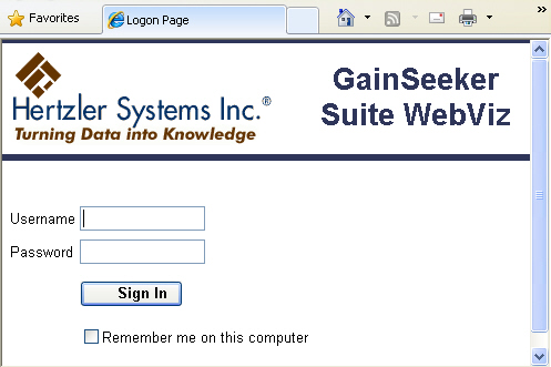 To launch GainSeeker WebViz, use your web browser to go to the hyperlink or URL that was provided by the administrator of your web server or intranet server. This will take you to a login page that looks something like this: