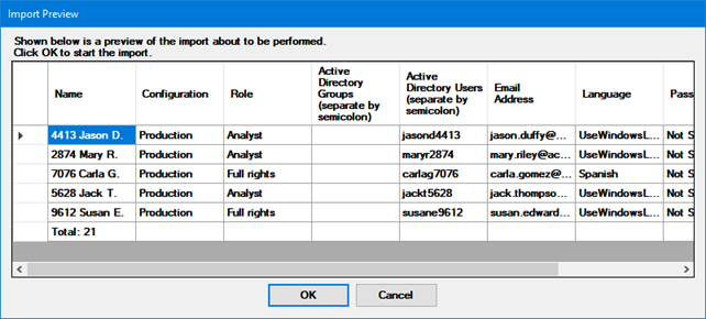 When no errors are detected, GainSeeker displays a preview of the first five users in the file and reports the total number of users that will be imported. If this looks correct, click OK to begin the import.