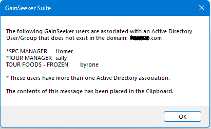 Click the Active Directory Check... button to check for Active Directory users or groups that do not exist but are associated with a GainSeeker user.