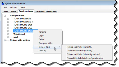 The View as Text right-click menu option for a configuration allows you to view the Tables and Paths or Traceability Labels selections for all your configurations or those selections for the selected configuration.