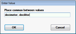 This setting displays an Enter Value dialog where you can add additional measurement units as a string (or remove them from the string). These measurement units are added (or removed from, if applicable) the list of available measurement units that display for that configuration on the SPC Standards Information dialog.