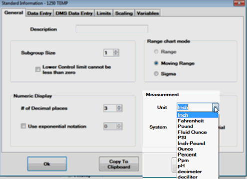 Enter new measurement units separated by commas in the text field (Fig. 1). The new units will display in the list of available measurement units on the General tab of the SPC Standards Information dialog (Fig. 2 ) when a standard is edited or created.