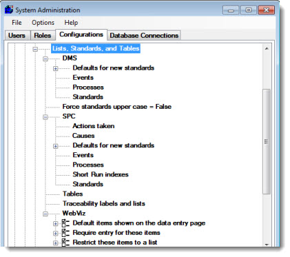 You can also set the traceability labels and predefined lists, predefined lists of potential process events and corrective actions, and fundamental information about each item for which you want to store quality data in the file paths and database tables. You can also set default options for creating new DMS and SPC standards.