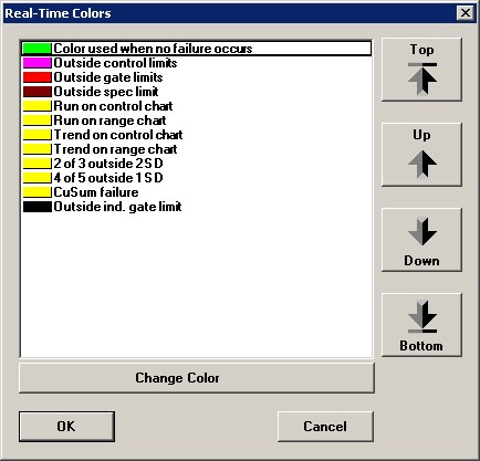 To change the relative priority of these real-time failure colors, click one of these failures and then click the Top, Up, Down or Bottom button to move the highlighted failure on the list.