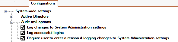 You can enable audit trail tracking in the Configurations node and the System-wide settings node on the Configurations tab in the System Administration module.
