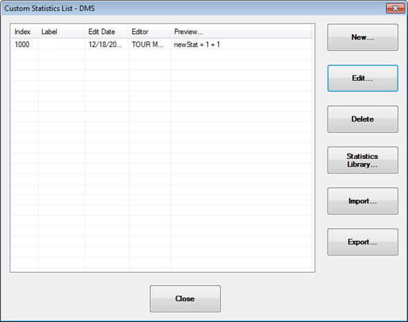The Custom Statistics List (SPC or DMS) window is used to create new statistics, edit existing statistics, import and export statistics, and related tasks.