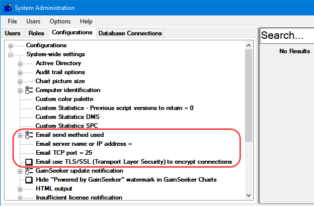 You can configure GainSeeker to send email via your email server. These settings are found in the System-wide settings branch on the Configurations tab of the GainSeeker System Administration module.