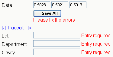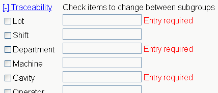 If the WebViz user selects the checkbox for one or more of these required traceability fields and proceeds to the data entry page, they cannot store a data subgroup unless values have been entered for the required traceability fields: