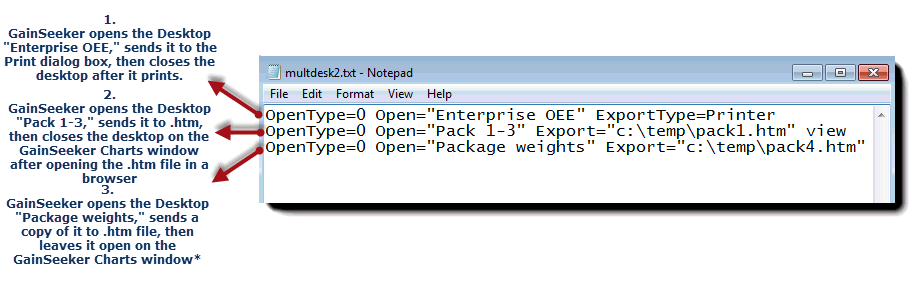 The OpenList="Filename" parameter specifies the full path and the name of a .txt file you create using a .txt editor, such as NotePad. The .txt file lists which Desktop names GainSeeker is to open, and any optional actions it is to execute for any of the desktops.