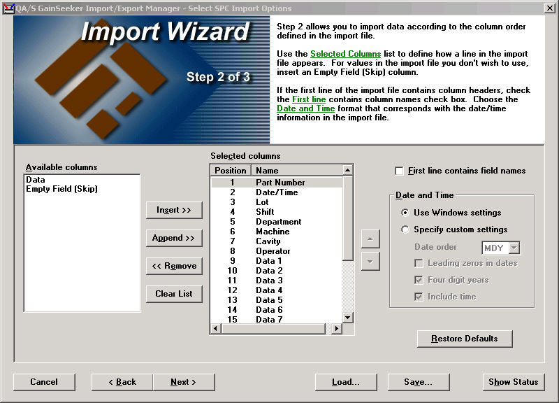 If you selected the Archive file type on the first step of the Import Export Manager, this step is unavailable. SPC and DMS archive files use a pre-defined file format.