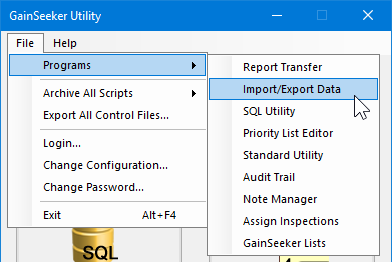 The Programs option in the File menu on the GainSeeker Utility module can be used as an alternate method for opening any of the Utility functions, as shown in this example: