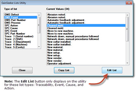 Click Edit List on the GainSeeker Lists Utility to edit the selected event, cause, or action list.