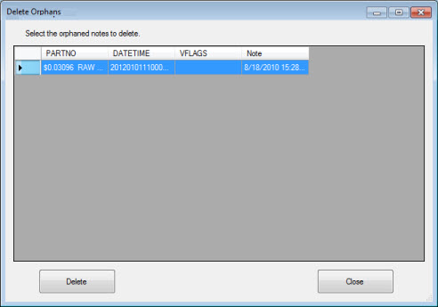 The Delete Orphans dialog opens displaying a list of the found orphaned notes.