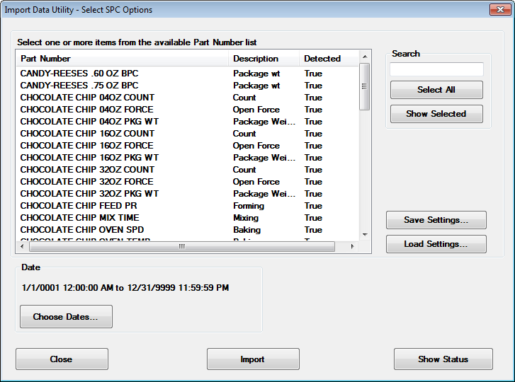 The Import Data Utility is used to import a saved file of data for part numbers/processes. You can import all of the data in the file or only the data for part numbers in the file that you choose. You can also limit the data in the file that you import by setting a date range.