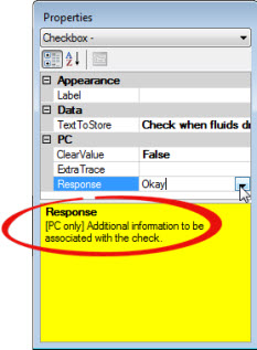 When you select a property by clicking in a cell on the left column of the properties grid, a description for that property's function opens in the yellow region at the bottom of the Properties panel. In the following example, the Response property for a Checkbox sub-inspection test has been selected (as indicated by the highlighted Response property). The description for that property displays.