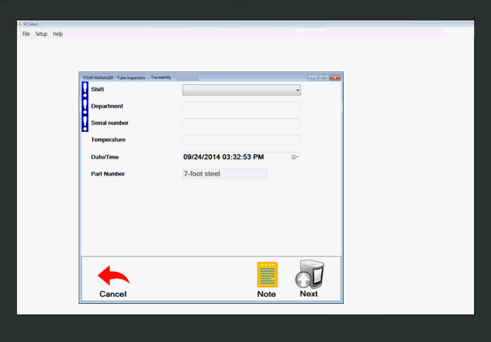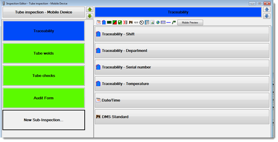 (Fig. 1) In the inspection Tube inspection below, Traceability would be the first sub-inspection to display in a running inspection, followed by sub-inspections Tube welds, Tube checks, and Audit form. The tests for sub-inspection, such as those contained in the Traceability sub-inspection selected below, would be performed in the order as they display on the editor from top to bottom: Traceability - Shift, followed by Traceability - Department, Traceability - Serial number, Traceability - Temperature, Date/Time, and DMS Standard, respectively.