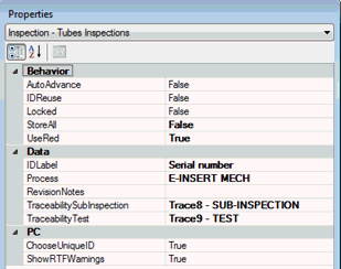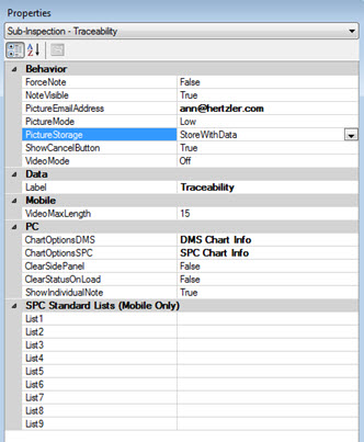 The PictureMode property is set to Off for the Traceability sub-inspection. For a mobile device inspection, this disallows the inspector from taking any photos on this sub-inspection page. For a PC inspection, this disallows the inspector from attaching photos to the data for this sub-inspection. (Taking photos while the operator is on the Traceability page is deemed irrelevant to the inspection process, at least for this example.)
