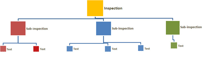 You can add as many sub-inspections to an overall inspection as you need. To each sub-inspection you can then add any number of applicable tests. The Inspection example in the following diagram contains three sub-inspections, each containing a different number of tests.