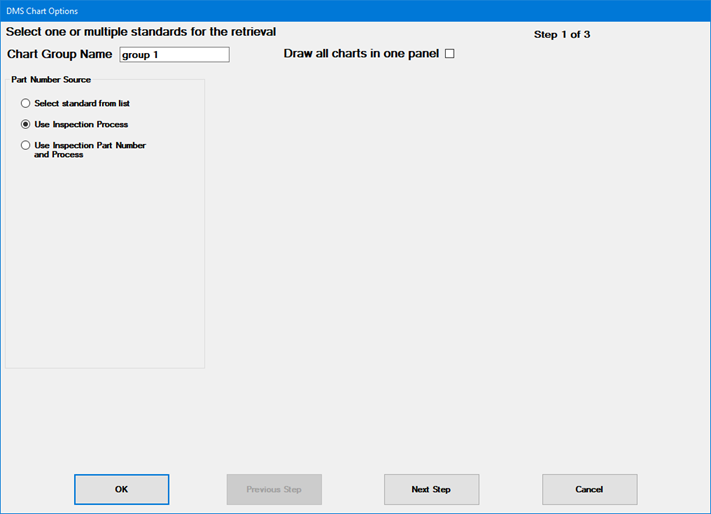 If you want this sub-inspection to chart multiple standards with the same chart types and chart settings (date period, filter, statistical settings, etc.), you can use this step to select all those standards at once – beginning with the Part Number Source: