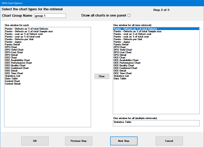 The DMS Chart Options window lets you configure charts to display on the current sub-inspection. For information on opening this window, see Setting charts to display in inspections.