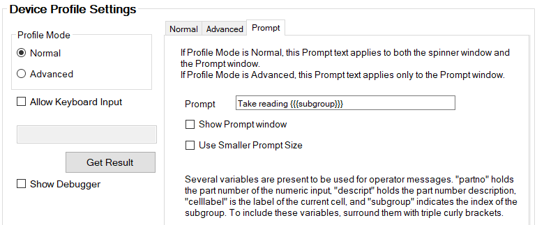 With Profile Mode set to Normal, you can customize the spinner window with your own Prompt text. This can include placeholders for four special variables {{{subgroup}}} (which measurement in the subgroup - 1, 2, etc.), {{{partno}}} (name of the SPC standard), {{{celllabel}}} (label of the current cell or data point in the subgroup being measured), and {{{descript}}} (Description of the SPC standard).