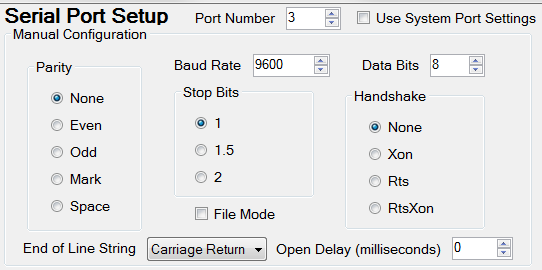You can either use the System Port Settings (computer settings for the selected COM port – configured in the Control Panel, Device manager) or set the Manual Configuration area to match the communication settings documented for your RS-232 device. To add a delay between opening the COM port and beginning communication tasks, set the Open Delay.