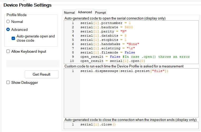 With Profile Mode set to Normal, you can easily configure additional settings for reading RS-232 input strings, writing output strings, extracting your data value from the input string, and prompting the inspector for readings.