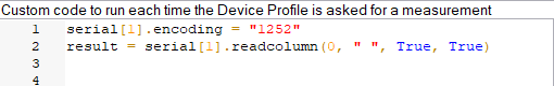 If encoding is required to read data from the device, you can add a line in the custom code section before the read to set the encoding