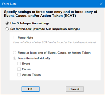 If selected, the presence of a real-time failure requires the inspector to use the test's Individual Note (next to the test) to enter either an Event, Cause, or Action Taken. Or, if the sub-inspection properties ShowIndividualNote and NoteVisible are both set to False, then the inspector is prompted to enter corrective action information after the Submit (sub-inspection data) button is pressed.