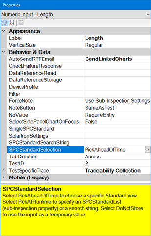 Select a single SPC standard to store with the test data. Use this property in conjunction with the PickAheadOfTime setting of the SPCStandardSelection property. You can double-click on the Numeric Input test to edit this property. [Mobile only]: The Numeric Input test is limited to storing data for a subgroup size of 8 or less. |