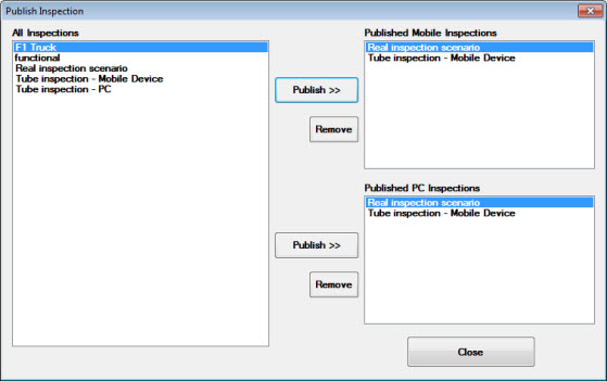 An inspection can be run on a PC, mobile device, or both. (See Differences in PC and Mobile inspections for more information.) When you publish an inspection you indicate on which of the device types you plan to run the inspection. Merely saving an inspection you have created does not make the inspection available for use. You must also publish it, which is a quick and easy task.