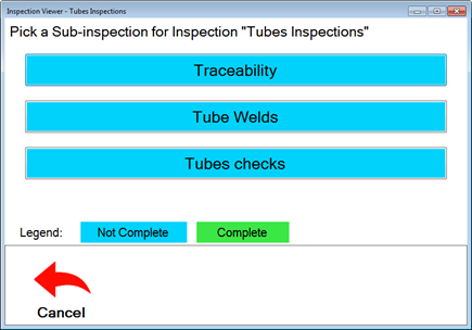 Note: Your inspection may also include a Cancel button, depending on how the inspection has been designed. When you click the Cancel button, data and information for that sub-inspection is not saved to the database. When you click the Cancel button, in most cases, you will automatically be returned to the page where you can select a sub-inspection to run.