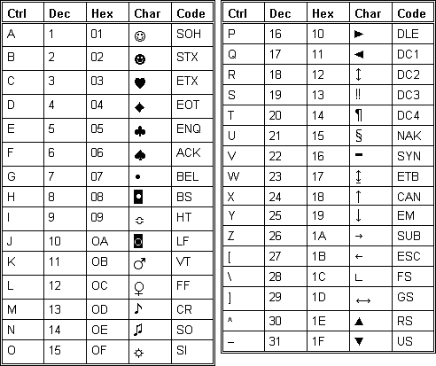 Character symbols for ASCII characters 1-31