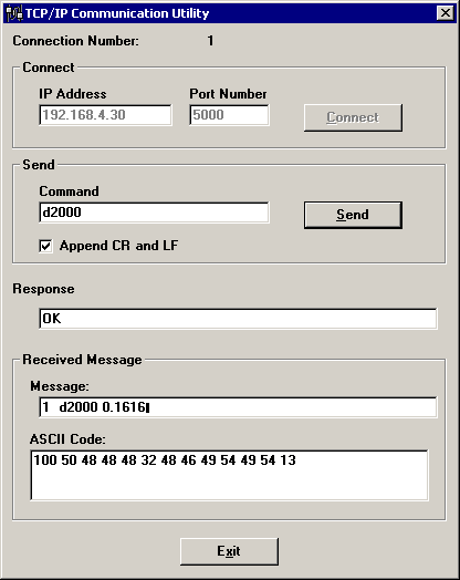 Sending d2000 as a command with carriage return and line feed check box checked gives the following response.