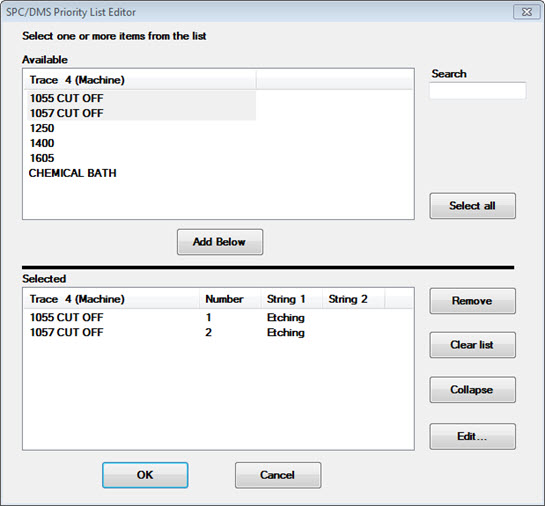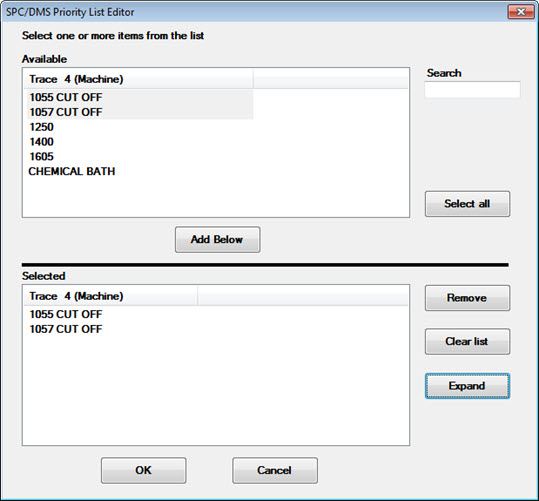 To set values in the last three columns, use the SPC/DMS Priority List Editor to edit the traceability priority list. Click the Expand button to show more options.