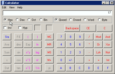 For example, typing the number 23 and then clicking Hex displays the following result: