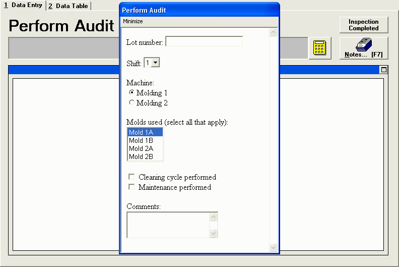 INITVARS : MySVar 'HTML_form' = ' <html> <body> <form action=""> <p> Lot number: <input type="text" name="lotnum" /> </p> <p> Shift: <select name="shiftnum"> <option>1</option> <option>2</option> <option>3</option> </select> </p> <p> Machine: <br /> <input type="radio" name="mach" value="Molder 1" checked="checked" />Molding 1<br /> <input type="radio" name="mach" value="Molder 2" />Molding 2 </p> <p> Molds used (select all that apply): <br /> <select name="molds" size="4" multiple="multiple"> <option value="1A" selected="selected">Mold 1A</option> <option value="1B">Mold 1B</option> <option value="2A">Mold 2A</option> <option value="2B">Mold 2B</option> </select> </p> <p> <input type="checkbox" name="clean" value="cleaned" /> Cleaning cycle performed<br /> <input type="checkbox" name="maint" value="maintenance" /> Maintenance performed </p> <p> Comments: <br /> <textarea name="notes" rows="3" cols="20"></textarea> </p> </form> </body> </html> ' : '' |