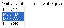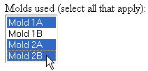 When you use the HTML_PARSE command with a type of "multiple" and an id/name of "item6" to retrieve the values selected from this list, it will return a tab-delimited string of the text between the <option> and </option> tags that correspond to the options selected by the user – "Mold 1A", "Mold 1B", "Mold 2A" and/or "Mold 2B" (or return a blank string if nothing is selected).