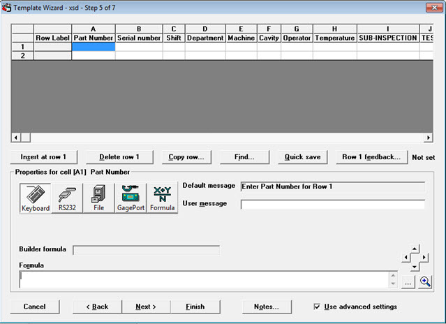 To use input modes other than keyboard input, to specify user messages, and to add formulas to the template, select the Use advanced settings check box on Template Wizard step 5.