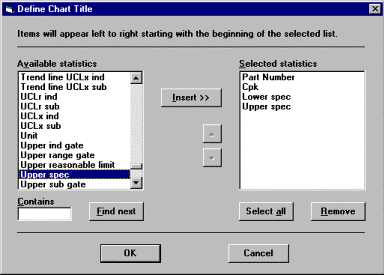 By default, the title bar of each chart will contain the name of the standard (part number and characteristic). However, you may add values such as control limits or Cpk to the chart title bars. Additional values you select will be displayed on the title bars of all charts for all the rows in the template.