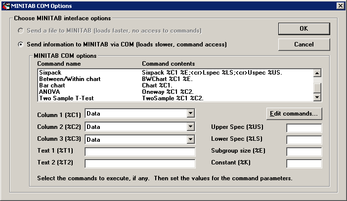 Command(s) – To select charting commands for MINITAB, click Commands. This will display the MINITAB COM Options screen: