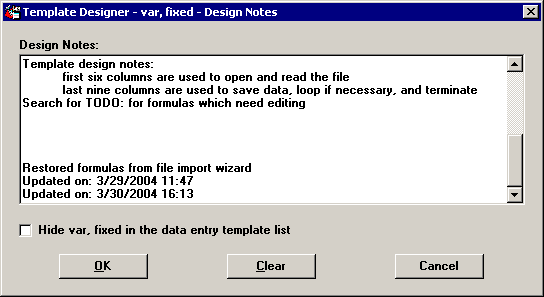 These notes can help you to identify how and when your template has been edited. In the example below, the first two lines at the end of the note indicate that the original template was edited and re-saved in the File Import Wizard on 3/29/2004. The last line indicates that the template was edited again on 3/30/2004 in the Template Wizard.