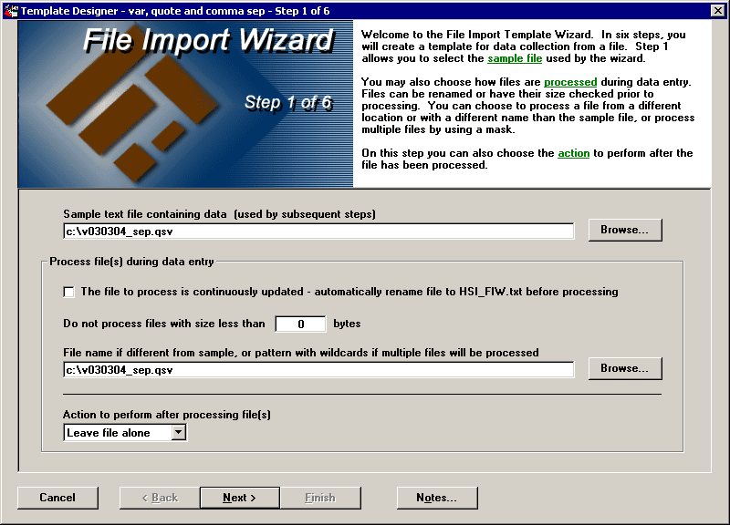 On the first step of the File Import Wizard, you can specify which file to use in the Wizard as a sample text file, which text files contain your process data, and how the template should process the text file(s) before and after reading the data into the GainSeeker system.