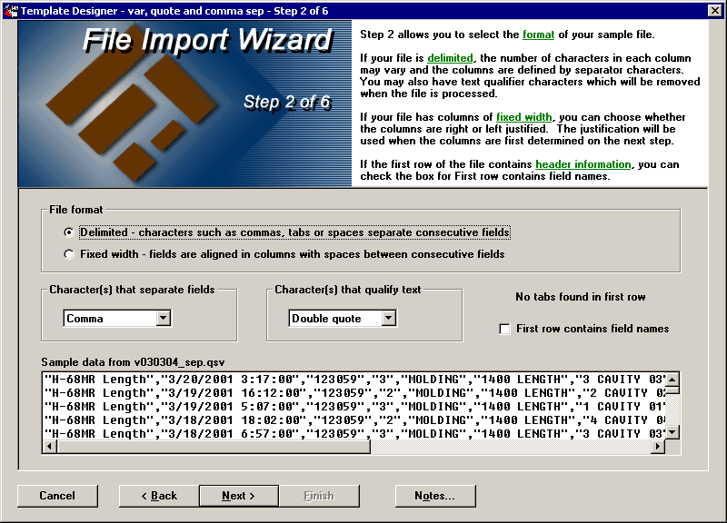 When you move to step 2 of the File Import Wizard, the first 25 lines from your sample text file are displayed in the Sample data from filename box at the bottom of the screen, to help you verify the way your text file is formatted. If each row of data is very long, you may need to scroll to the right to see all of the information in the row. Blank lines in your text file are ignored on this screen and will also be ignored when the template is processing data.