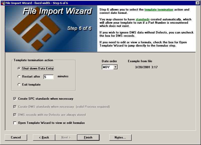 On step 6 of the File Import Wizard, you can select the template termination action, options for handling standards and DMS records with no defects, and the correct date format. You can also choose to open the Template Wizard immediately upon finishing the template in the File Import Wizard.